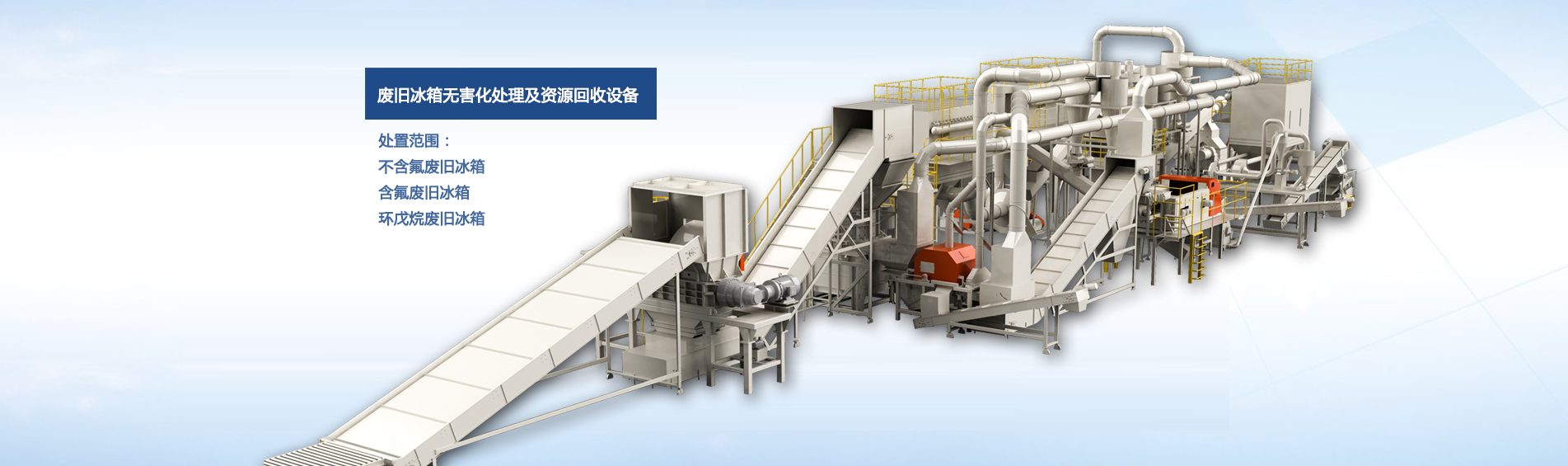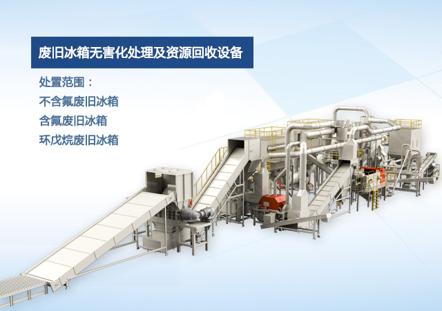 公司自主研發(fā)的廢舊冰箱無害化處理及資源回收技術(shù)及設(shè)備, 獨(dú)具 “雙軸撕碎機(jī)+立式破碎機(jī)+大風(fēng)量稀釋環(huán)戊烷氣體”的專利組合設(shè)計(jì), 主要用于對廢舊冰箱中的各種原材料進(jìn)行分離、 回收和利用, 具有自主知識產(chǎn)權(quán), 經(jīng)國家工業(yè)和信息化部科技成果鑒定為 “填補(bǔ)國內(nèi)空白, 達(dá)到國際先進(jìn)水平” 。